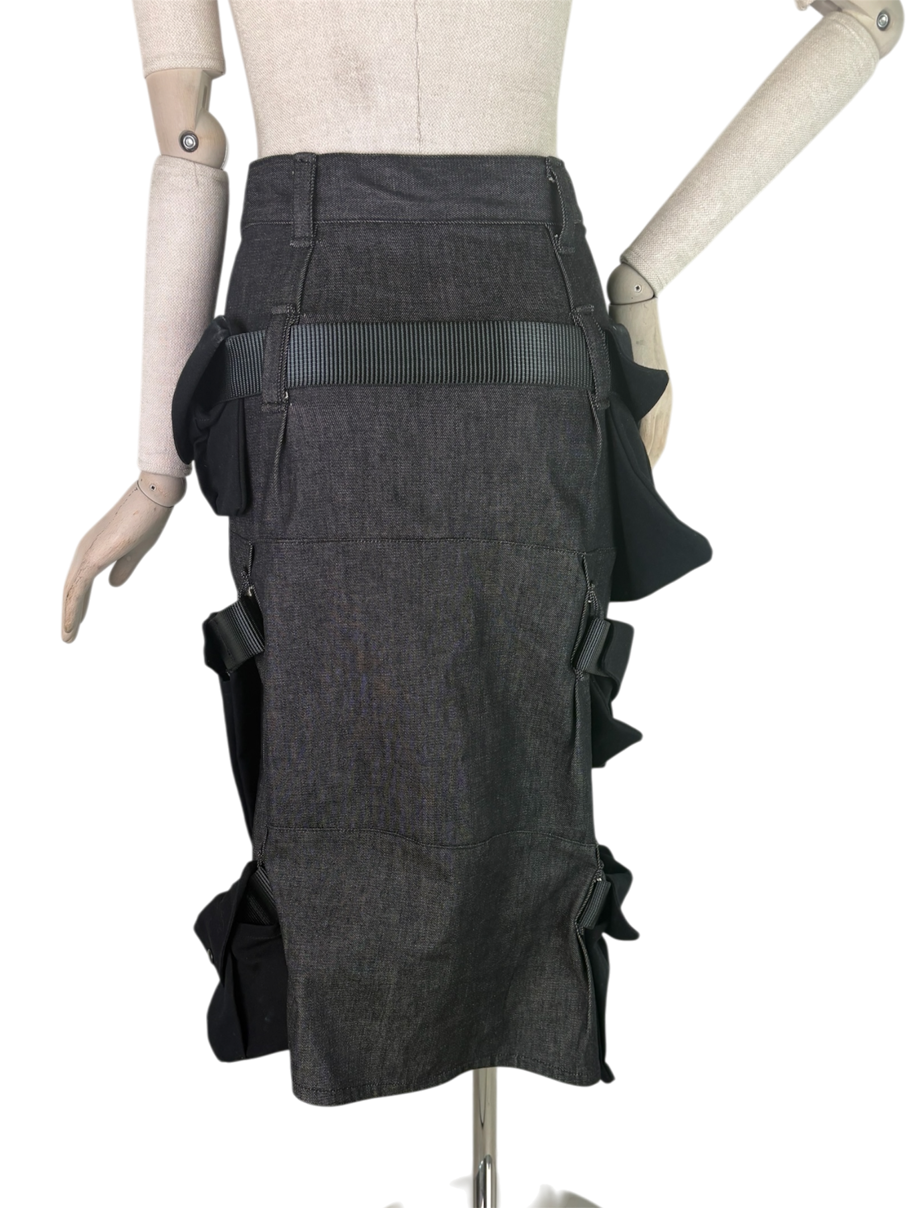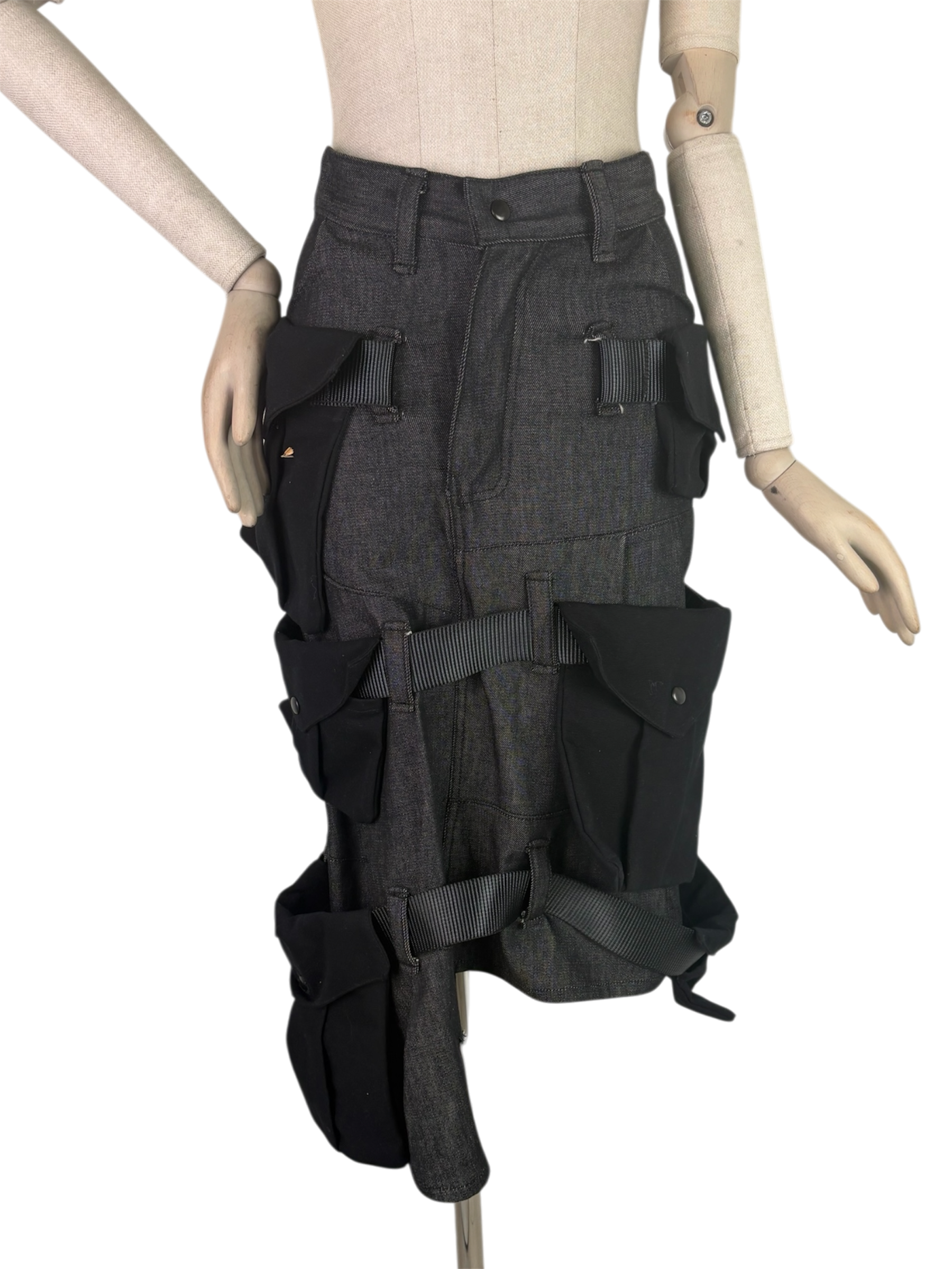 gray denim, webbing straps, black canvas cargo pockets. imagine all the nonsense you could fit in those pockets…..