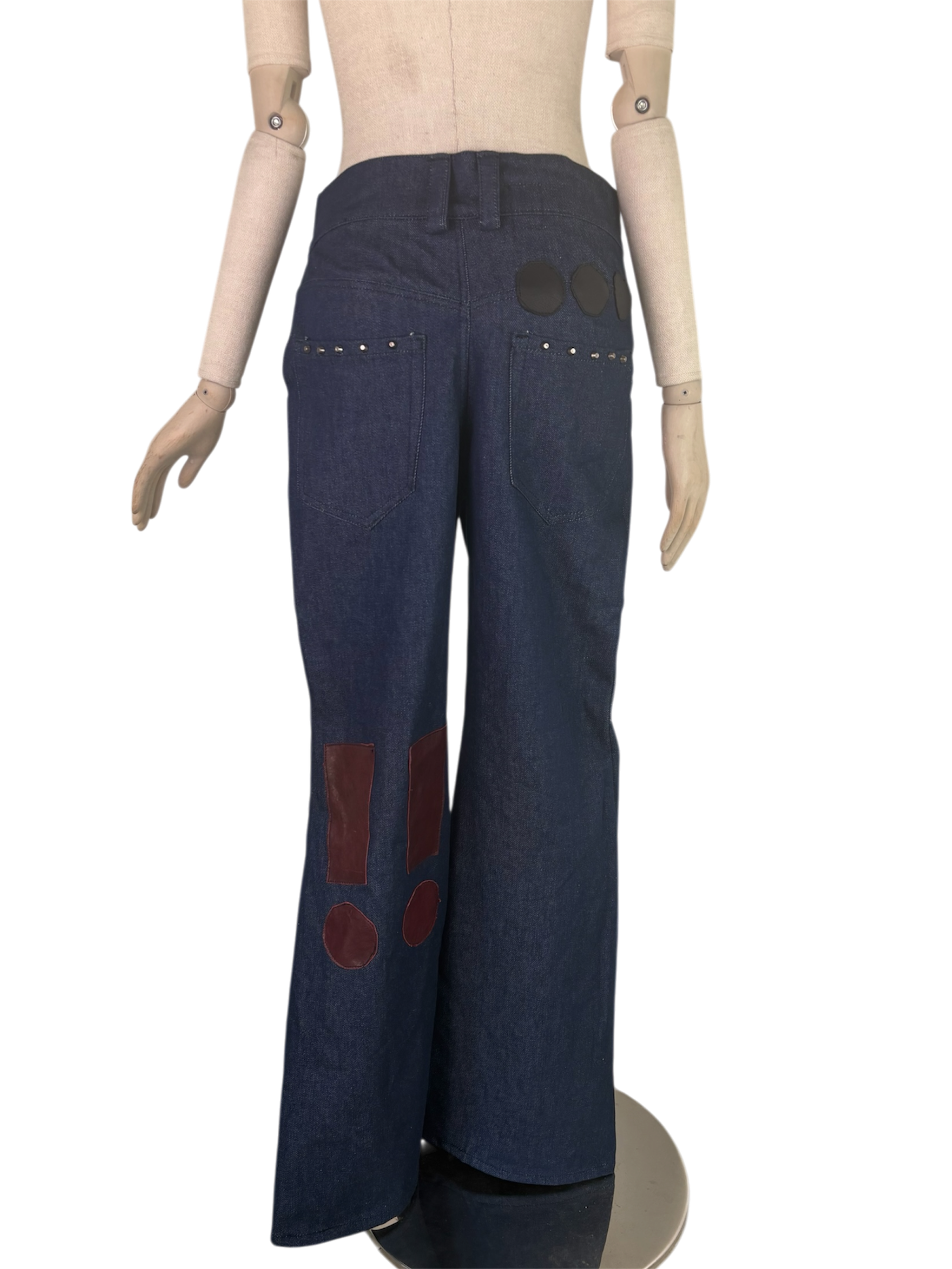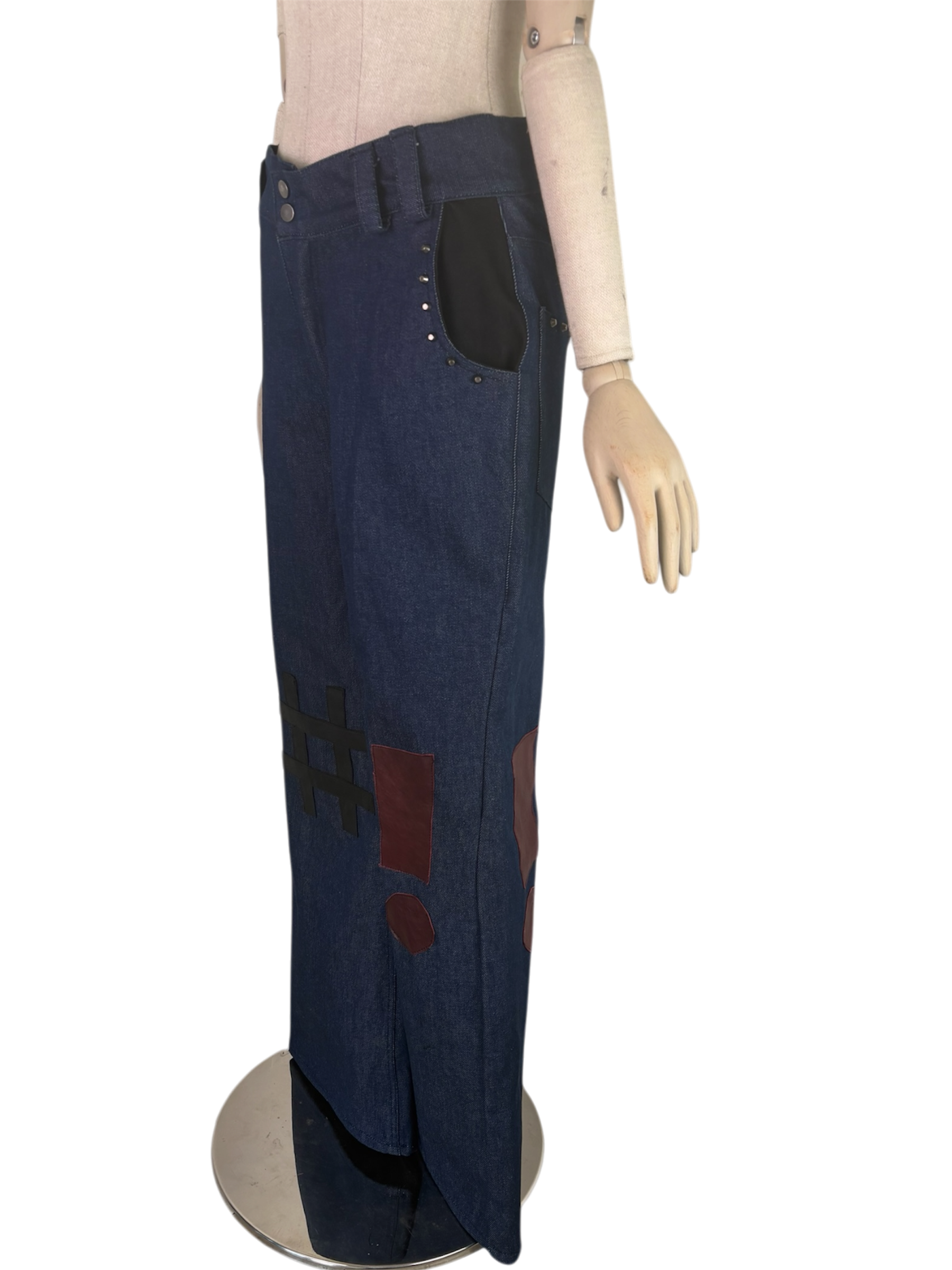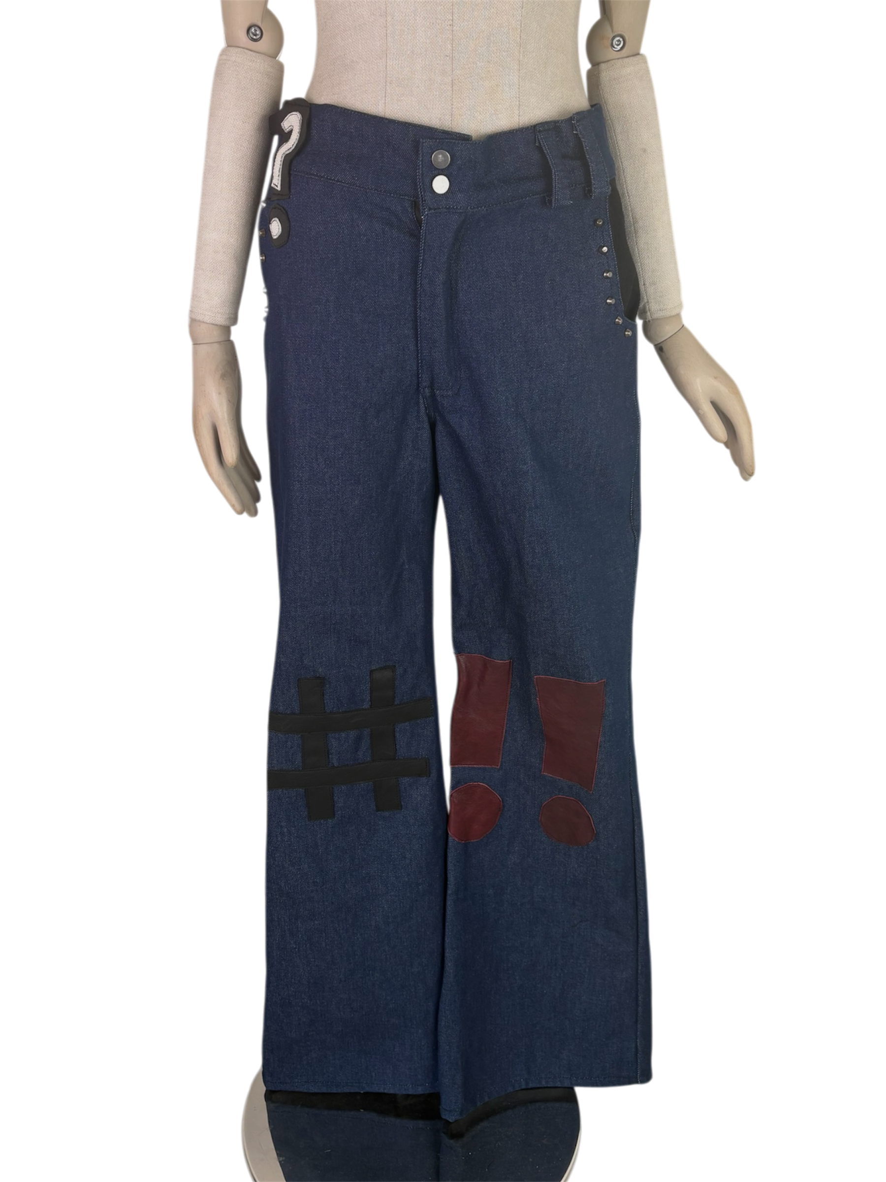 blue denim, leather punctuation mark accents. gunmetal bucket rivets. is a hashtag considered a punctuation mark? well, it’s on there regardless.