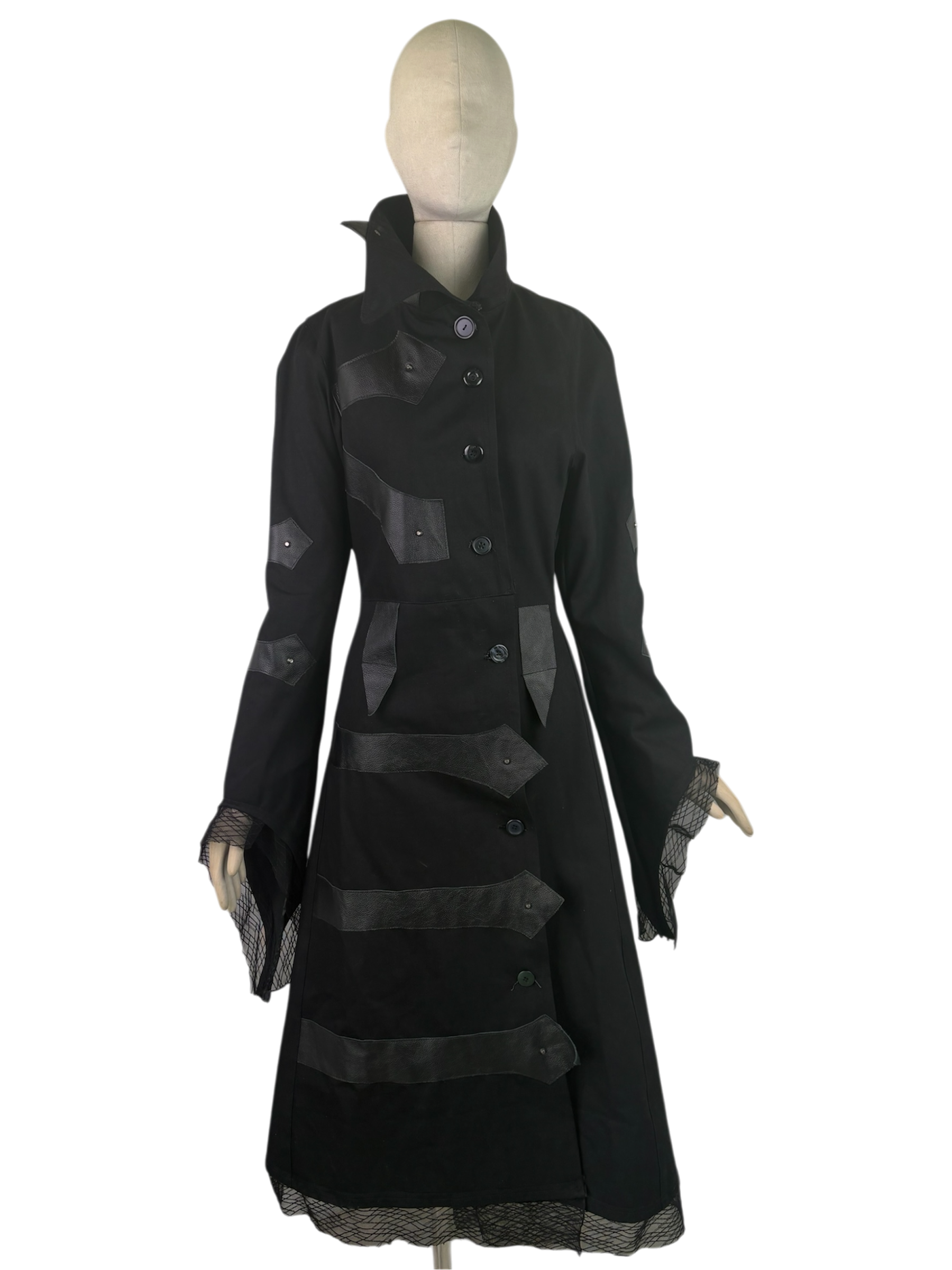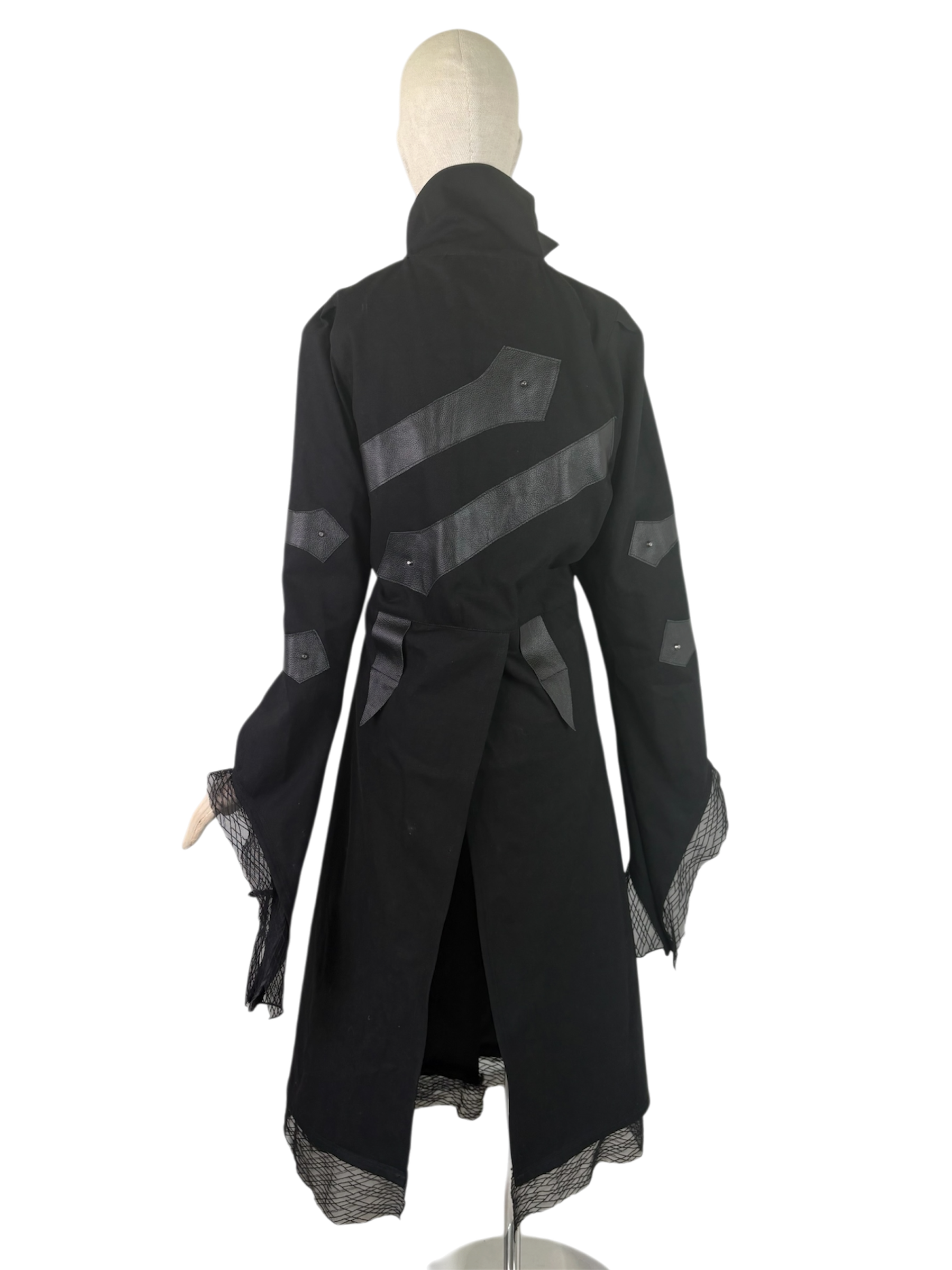 black denim with leather and lace accents. bucket rivets for a gunmetal flair. hand-sewn button closure. ominous and brooding aura or something.
